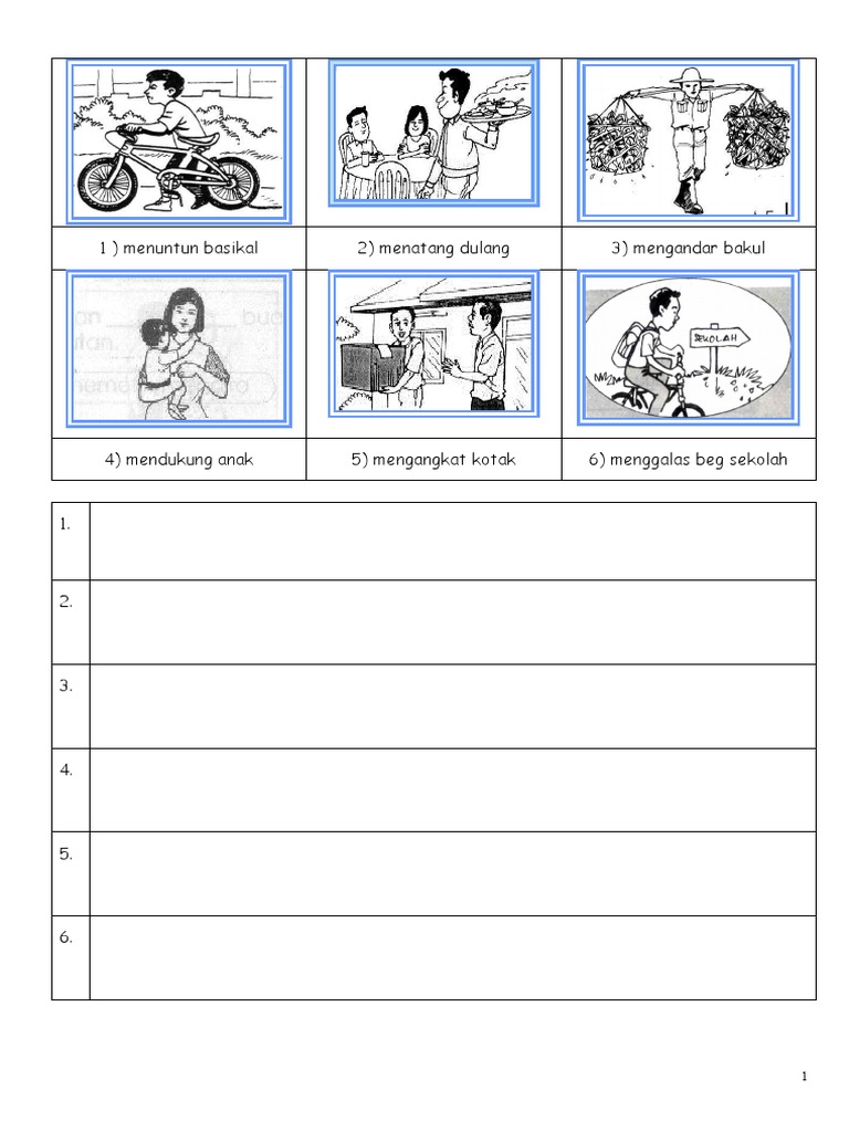 1 menuntun basikal 2 menatang dulang 3 mengandar bakul 4. Recommended bina ayat berdasarkan gambar. Bina empat ayat berdasarkan gambar dengan menggunakan penjodoh bilangan.